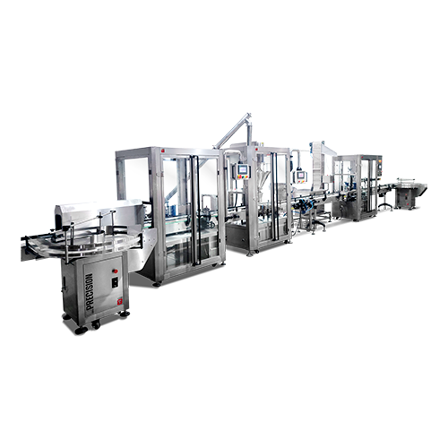 A Linha Precision se destaca pela eficácia, permitindo uma produção consistente de frascos esterilizados e rotulados com alta qualidade. Cada equipamento desempenha um papel específico na fabricação e rotulagem dos produtos, enquanto a tecnologia empregada assegura a integridade dos produtos embalados. O processo de produção se inicia com a Mesa Acumuladora Giratória, que mantém uma rotação contínua de frascos vazios ou acumula os frascos já produzidos. Em seguida, os frascos passam pelo Túnel UV, onde raios ultravioleta esterilizam as embalagens, preparando-as para receber os produtos.